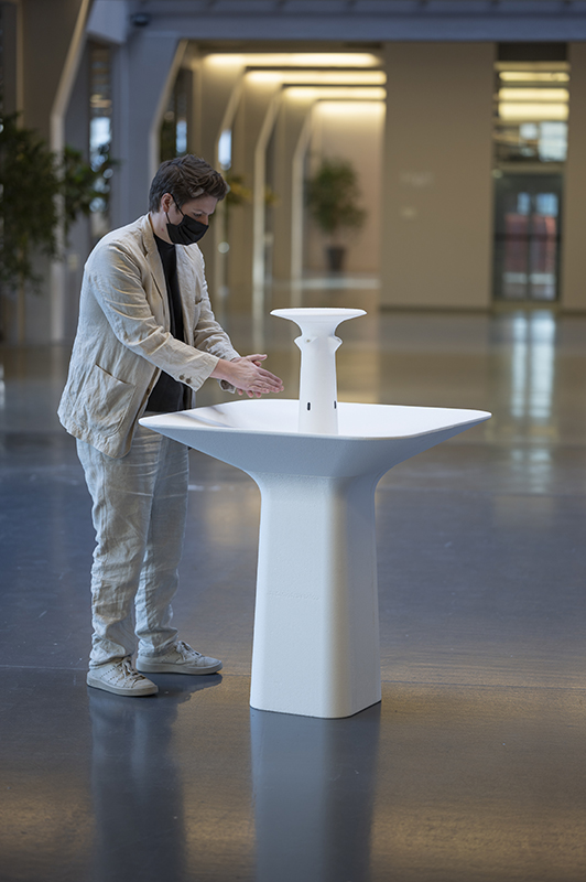 How could I help the company LAUFEN to bring the washbasin out of the bathroom and into a new context? My proposal wants to reinterpret the classic fountain and combines it with the communal washbasin. As a 360 degree approachable anchor in space it lives in entrance halls of banks, hotel lobbies, or offices.